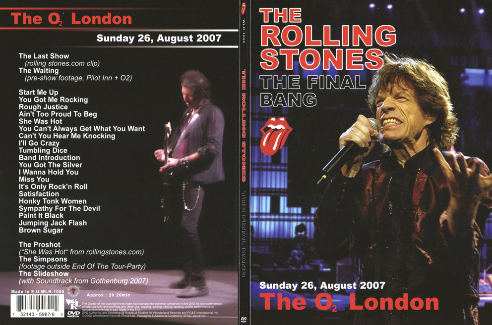 07.05.2008. Из новинок на рынке бутлегов следует назвать двухслойный DVD "The Final Bang" с записью последнего на сегодняшний день концерта "Роллингов" в Лондоне 26 августа 2007 г. На диске смонтированы воедино съемки с восьми камер. Обложка с содержанием здесь.