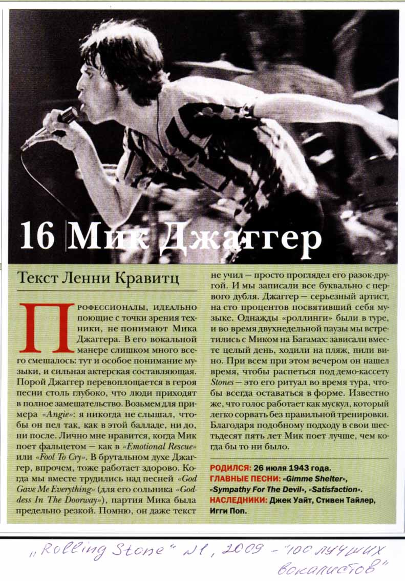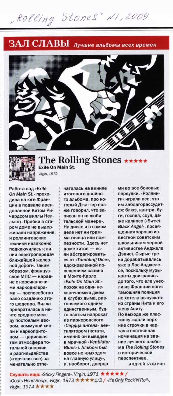 В российском варианте журнала "Rolling Stone" за январь появились рецензия на альбом "Exile On Main St.", а также перечень лучших рок-вокалистов мира, 16-е место в котором занимает Мик Джаггер. (За сканы спасибо Нине Митрохиной, г. Липецк).