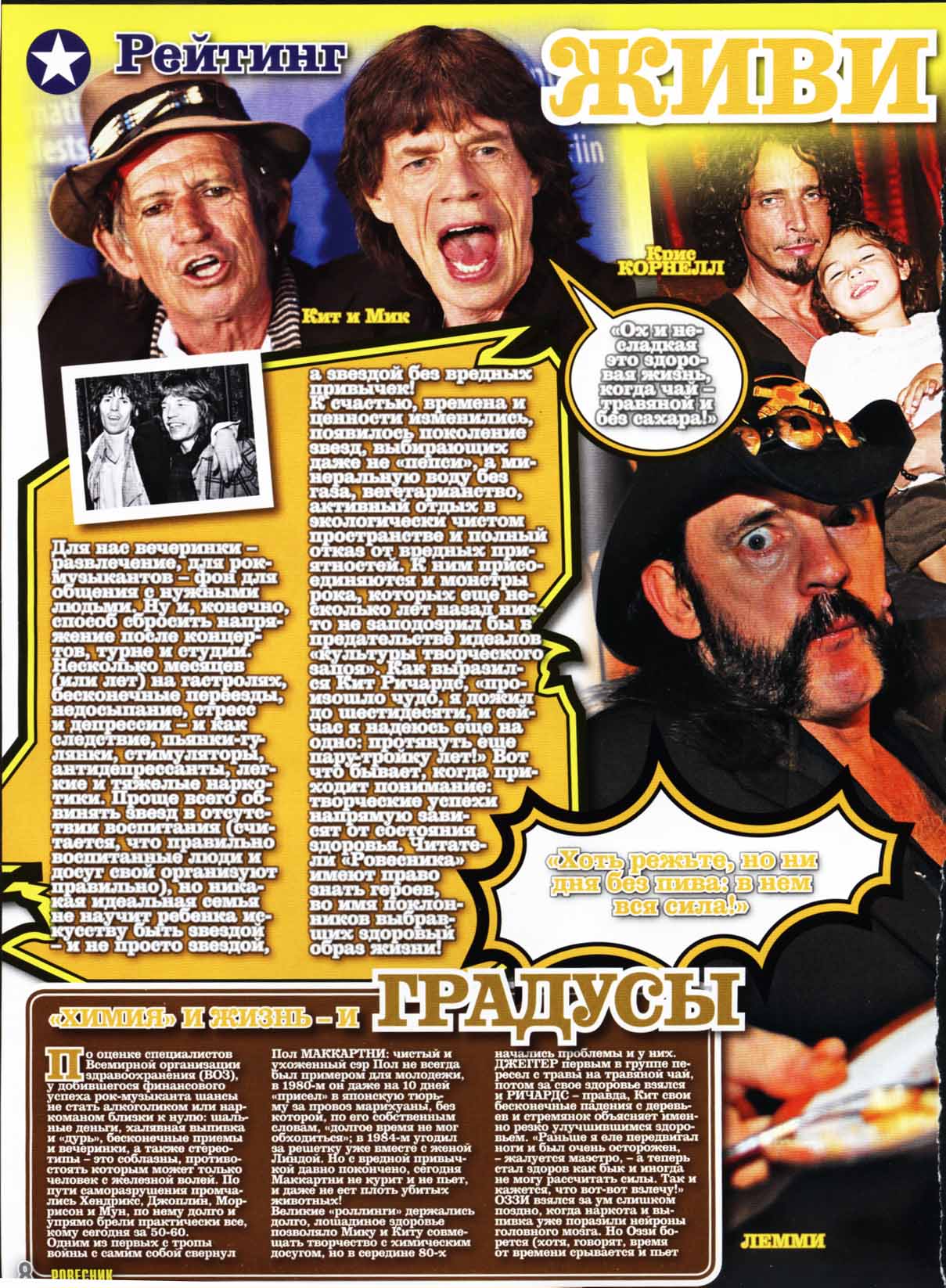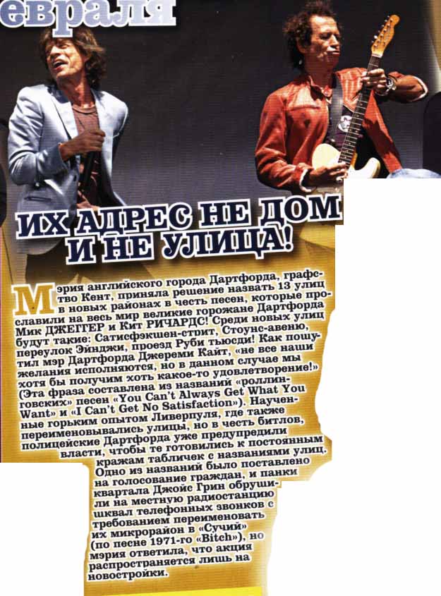 31.01.2009. В февральском номере журнала "Ровесник" - два упоминания "Роллингов" с фотографиями: в статье "Их адрес не дом и не улица" и в материале Данилы Морони "Живи быстро - но живи!" (здесь и здесь). За сканы большое спасибо Нине Митрохиной (г. Липецк).