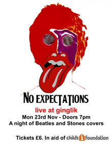 Забавный флаер придумали к концерту музыканта Питера Финчэма и группы "No Expectations" в клубе "Ginglik" на Шефердс-Буш-Грин в Лондоне (на фото справа). Концерт этот пройдет 23 ноября, и в нем будут исполнены кавера на "Битлз" и "Роллингов".