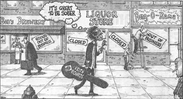 26.01.2010. Справа: карикатура из американской прессы по поводу недавнего заявления Кита Ричардса о том, что он не пьет уже 4 месяца (cогласно одним данным - по совету лечащего врача, по другим - что его отвратил недавний пример Ронни Вуда, который по пьяному делу развелся с женой). На рисунке Ричардс говорит про себя: "Как хорошо быть в завязке" на фоне закрытых после кризиса бакалейных магазинов.