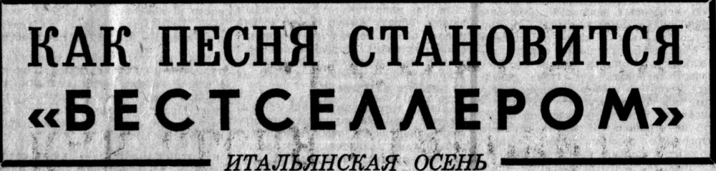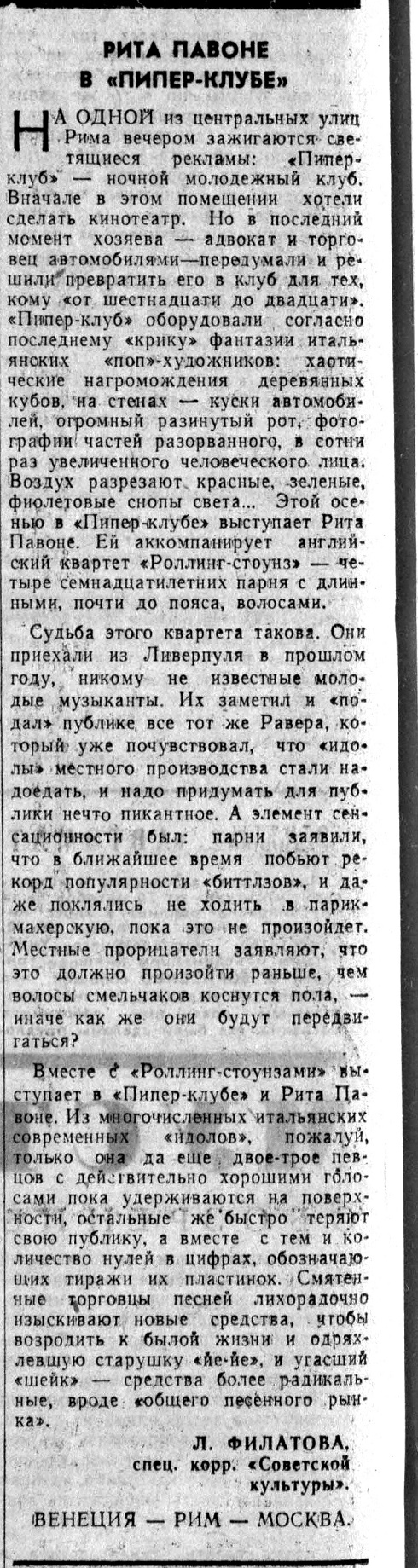 ** Рита Павоне — итальянская поп-певица, род. в 1945 г., посетила СССР в июле 1965 г.; её концерт в Зелёном Театре Парка Горького, Москва, сопровождался невиданными для